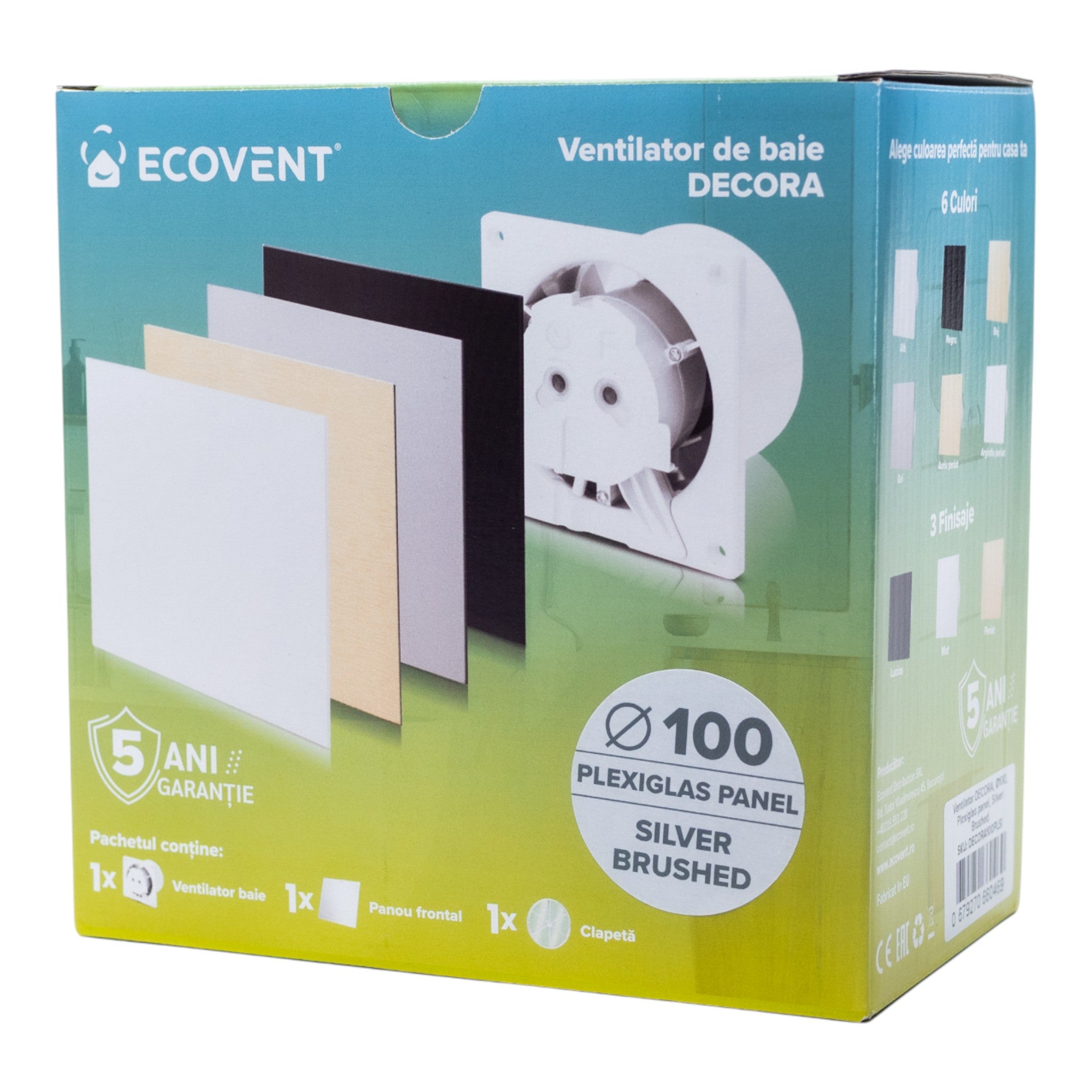 Manual de utilizare pentru Ventilator de baie Ecovent DECORA, Ø100, Super Silent, Panou Plexiglas schimbabil, Clapeta antiretur, Debit 93 m3/h, Garanție 5 ani, Argintiu Satinat