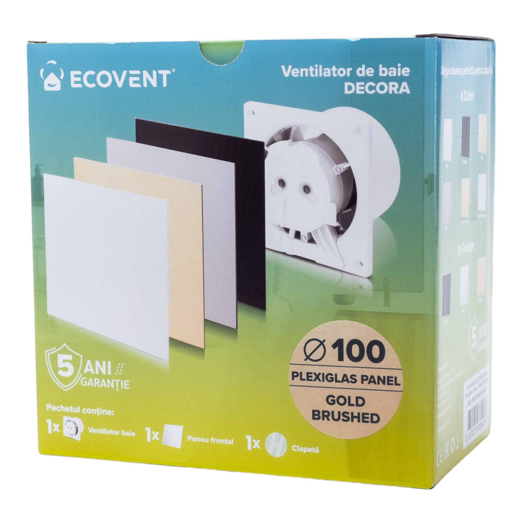Ventilator de baie Ecovent DECORA, Ø100, Super Silent, Panou Plexiglas schimbabil, Clapeta antiretur, Debit 93 m3/h, Garanție 5 ani, Auriu Satinat