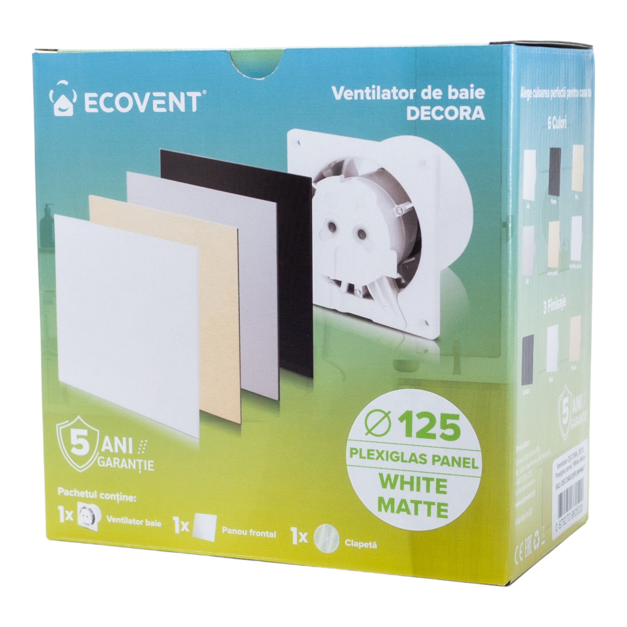Ventilator de baie Ecovent DECORA, Ø125, Super Silent, Panou Plexiglas schimbabil, Clapetă antiretur, Debit 140 m3/h, Garanție 5 ani, Alb