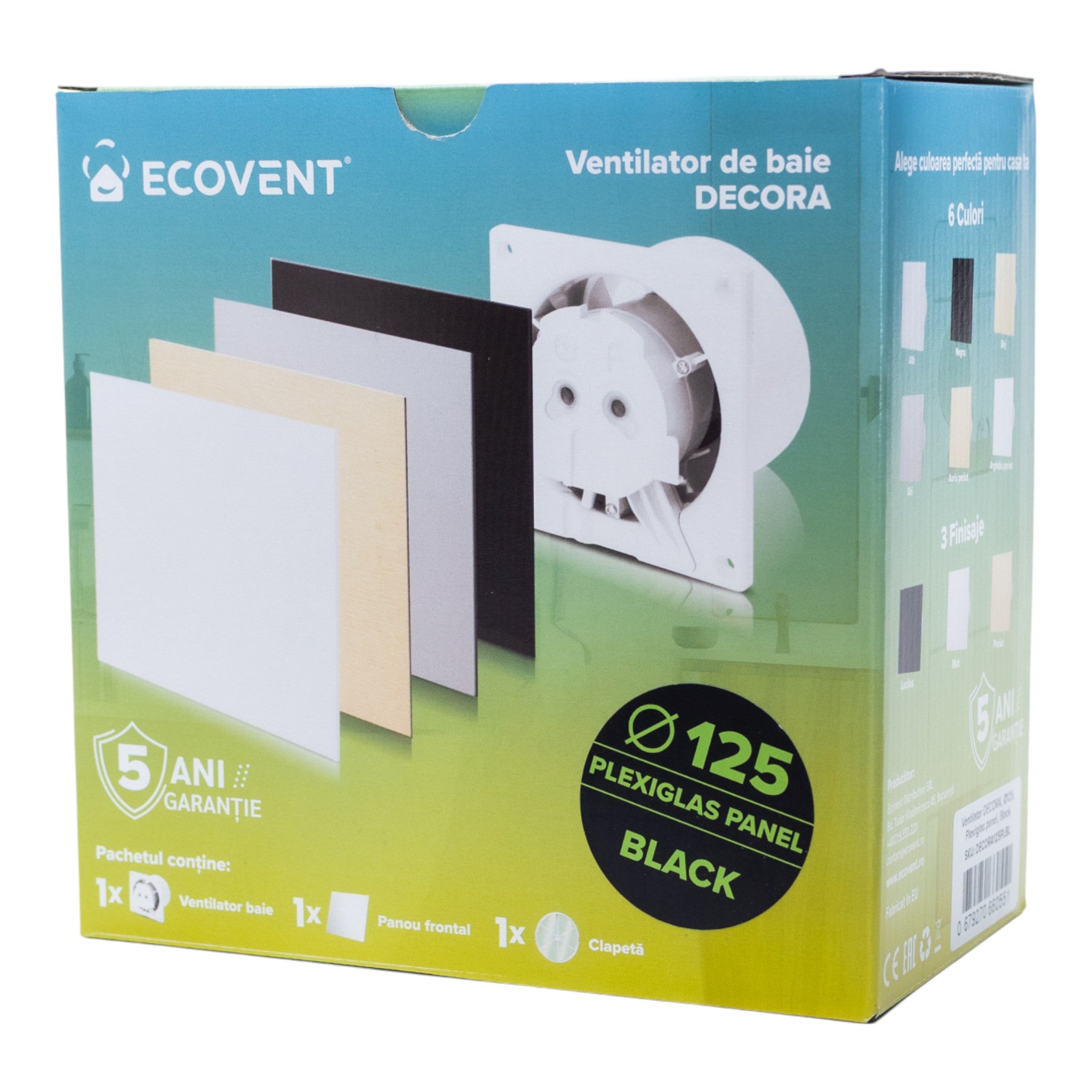 Ventilator de baie Ecovent DECORA, Ø125, Super Silent, Panou Plexiglas schimbabil, Clapetă antiretur, Debit 140 m3/h, Garanție 5 ani, Negru