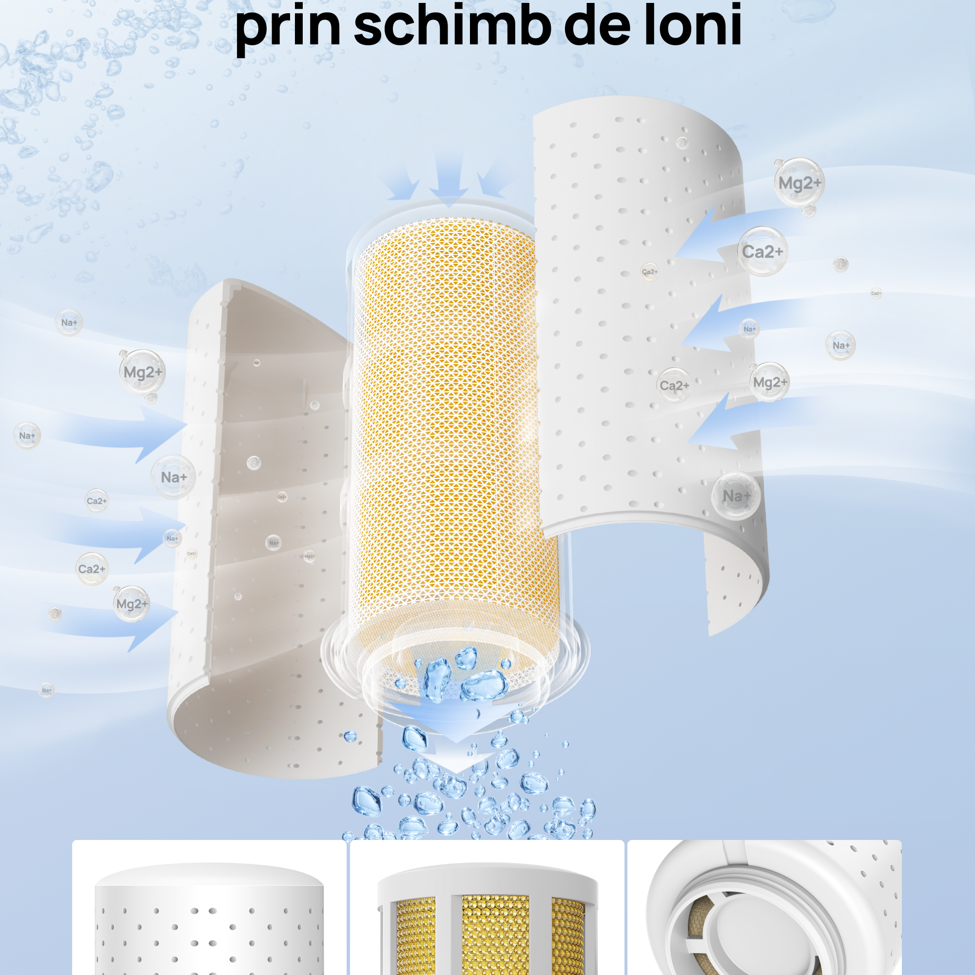 Neutralizarea Mineralelor (Ionic Exchange): Utilizează o rășină de schimb ionic de calitate superioară pentru a capta metalele grele și ionii de Calciu (Ca2+) și Magneziu (Mg2+). Testele interne confirmă reducerea semnificativă a acestora, eliminând „praful alb” care se depune pe mobilă.