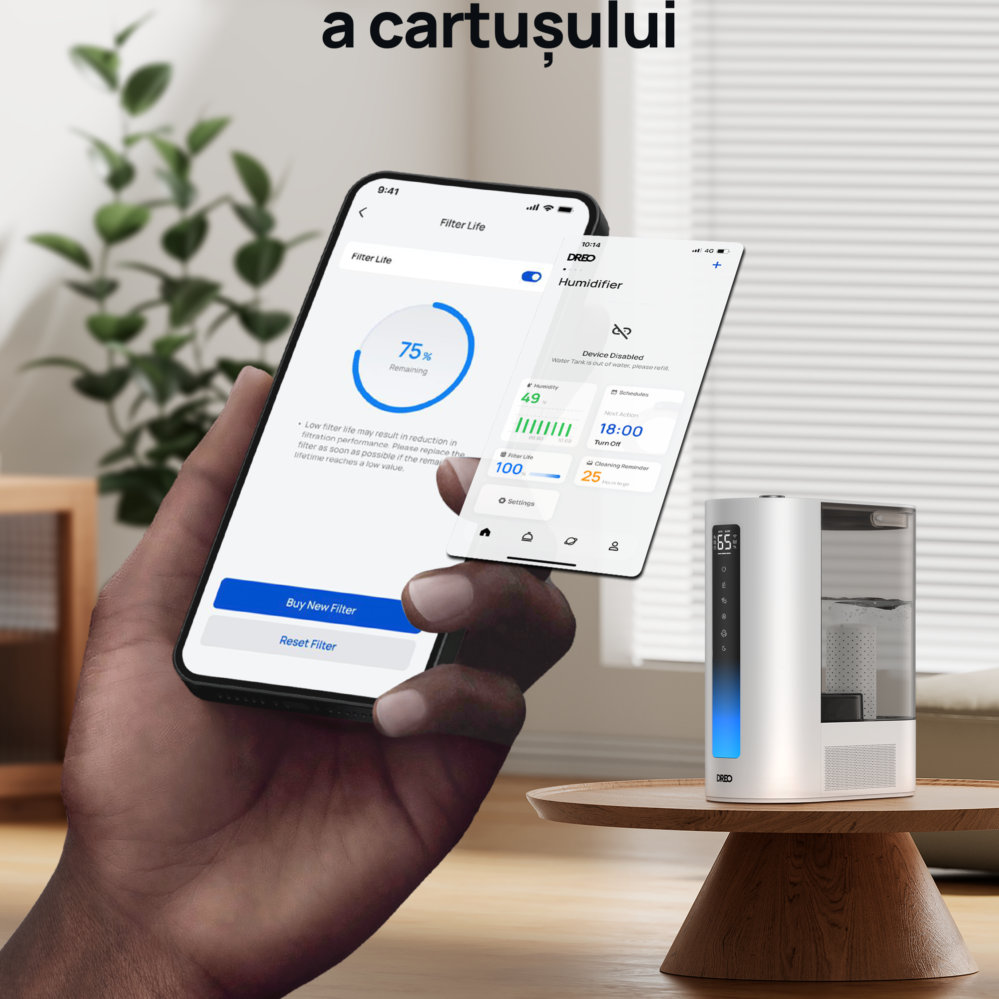 Resetare: Din aplicația DREO sau de pe panoul de control, resetați contorul pentru „Filter Life”.