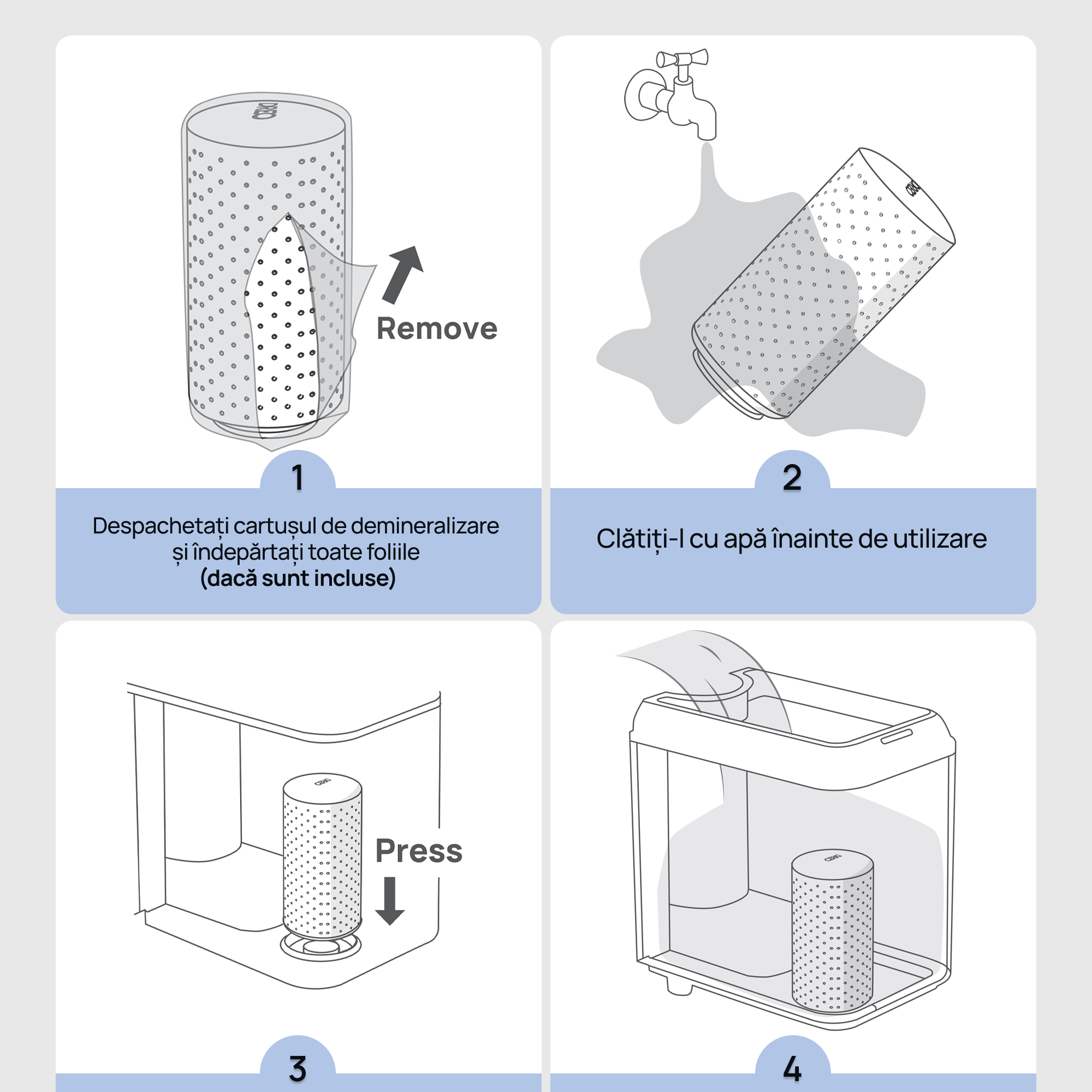 Instalare: Atașați cartușul în slotul rezervorului și umpleți-l cu apă la temperatura camerei (evitați apa fierbinte).