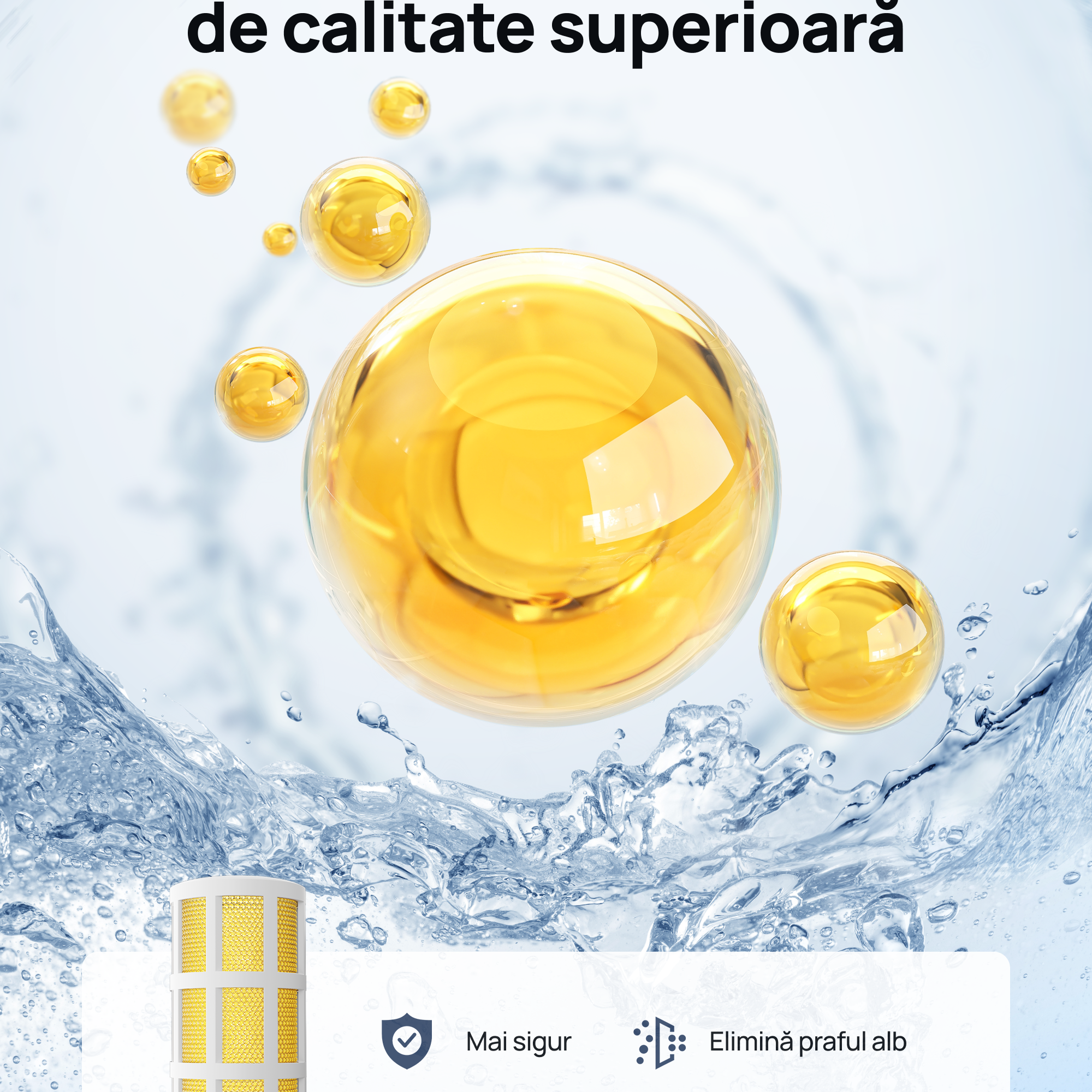 Mai sigur pentru tine: Menține un pH echilibrat al apei și reduce prezența particulelor fine (PM 2.5), protejând tractul respirator și pielea sensibilă.