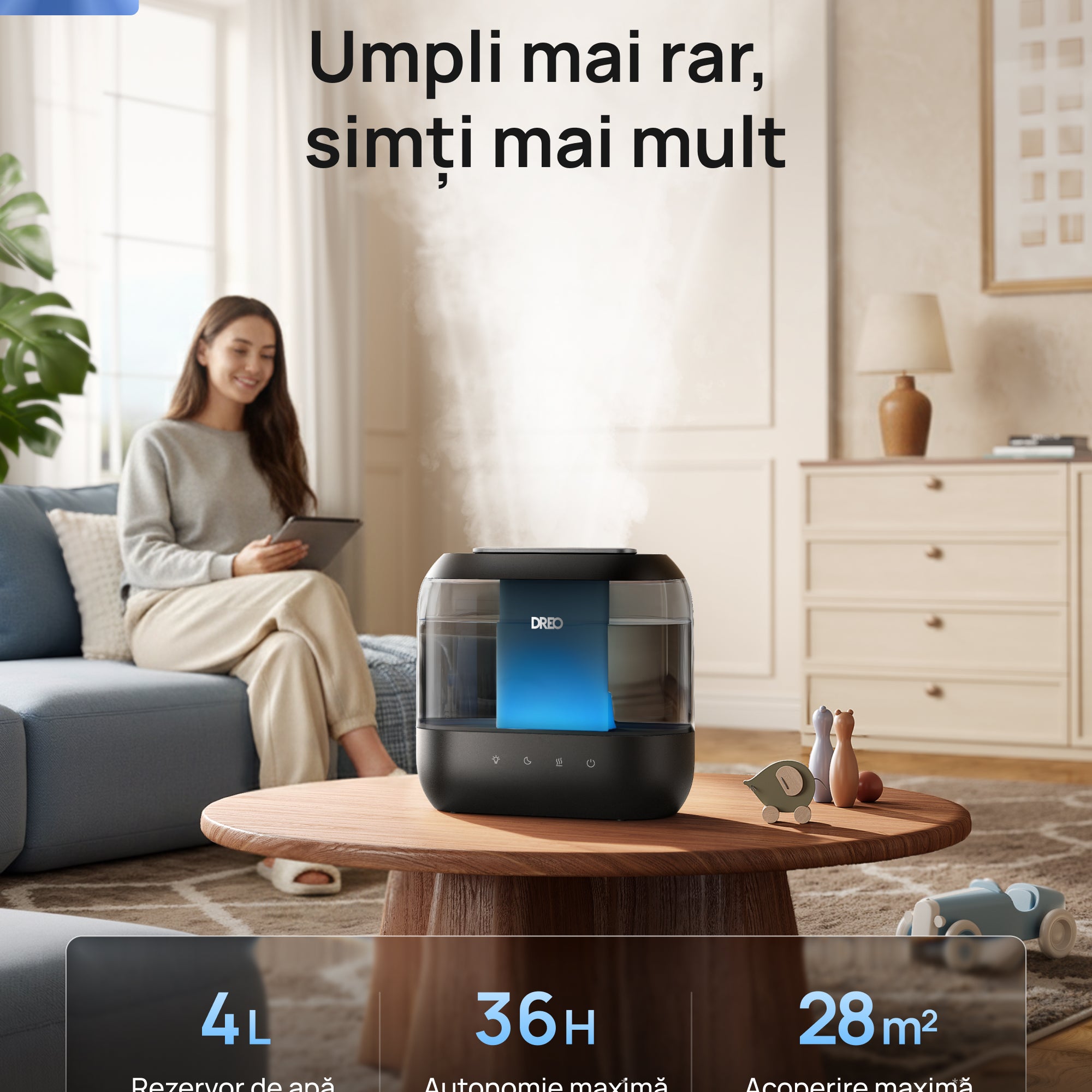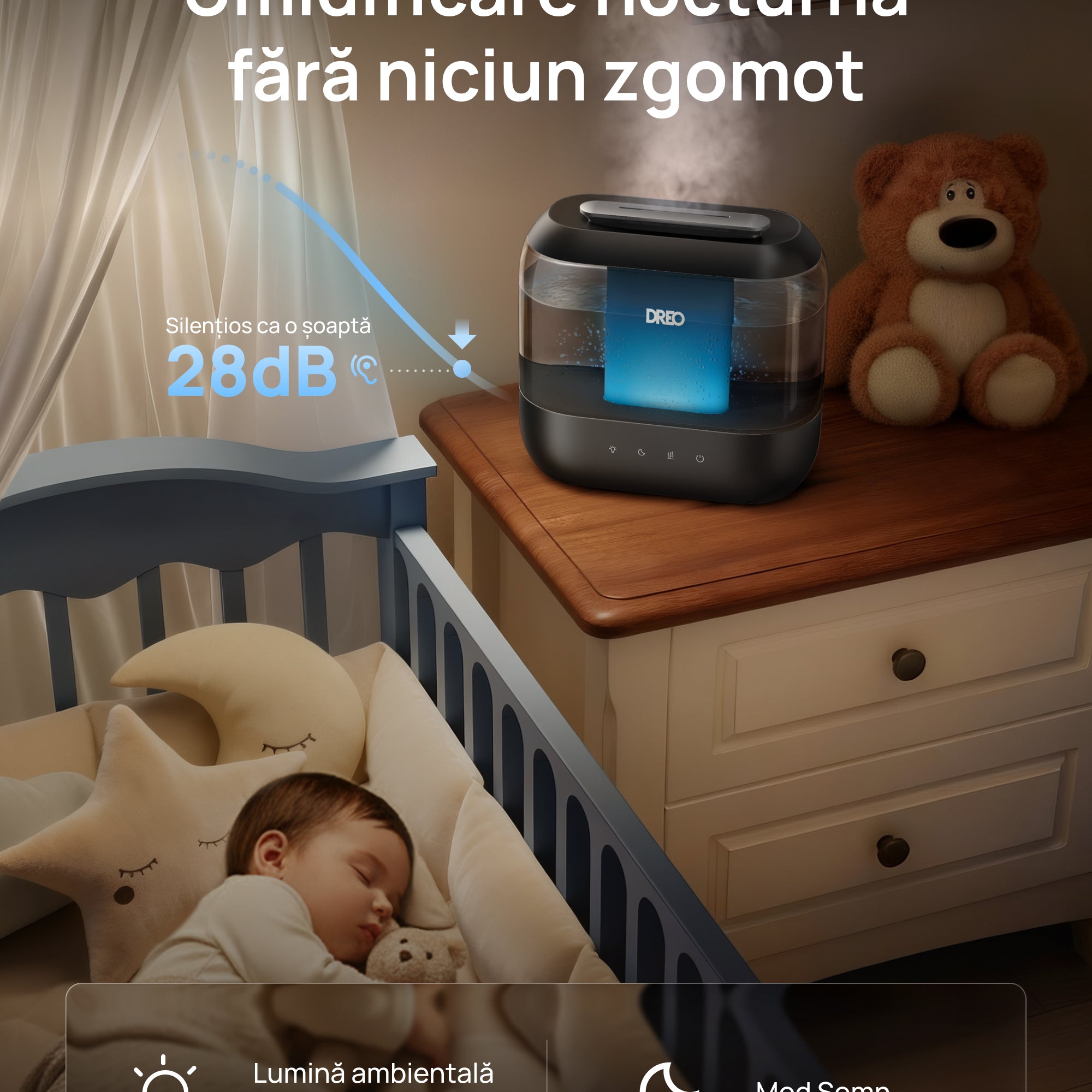 32 de ore de confort neîntrerupt: Bucură-te de aer umidificat și liniște pe tot parcursul nopții; designul acustic Dreo reduce zgomotul la 28 dB, în timp ce rezervorul de 4L asigură funcționarea fără a fi nevoie de reumplere peste noapte.