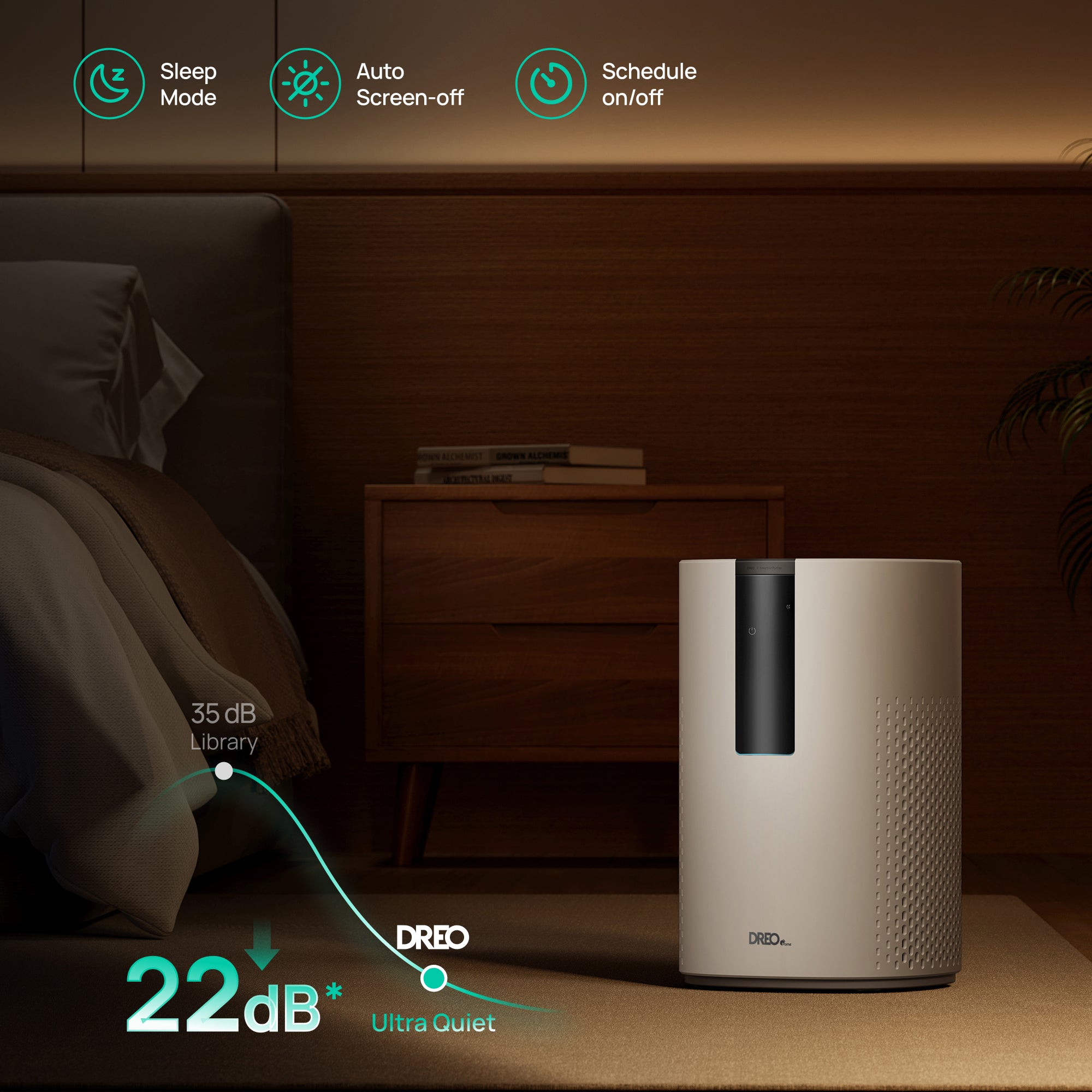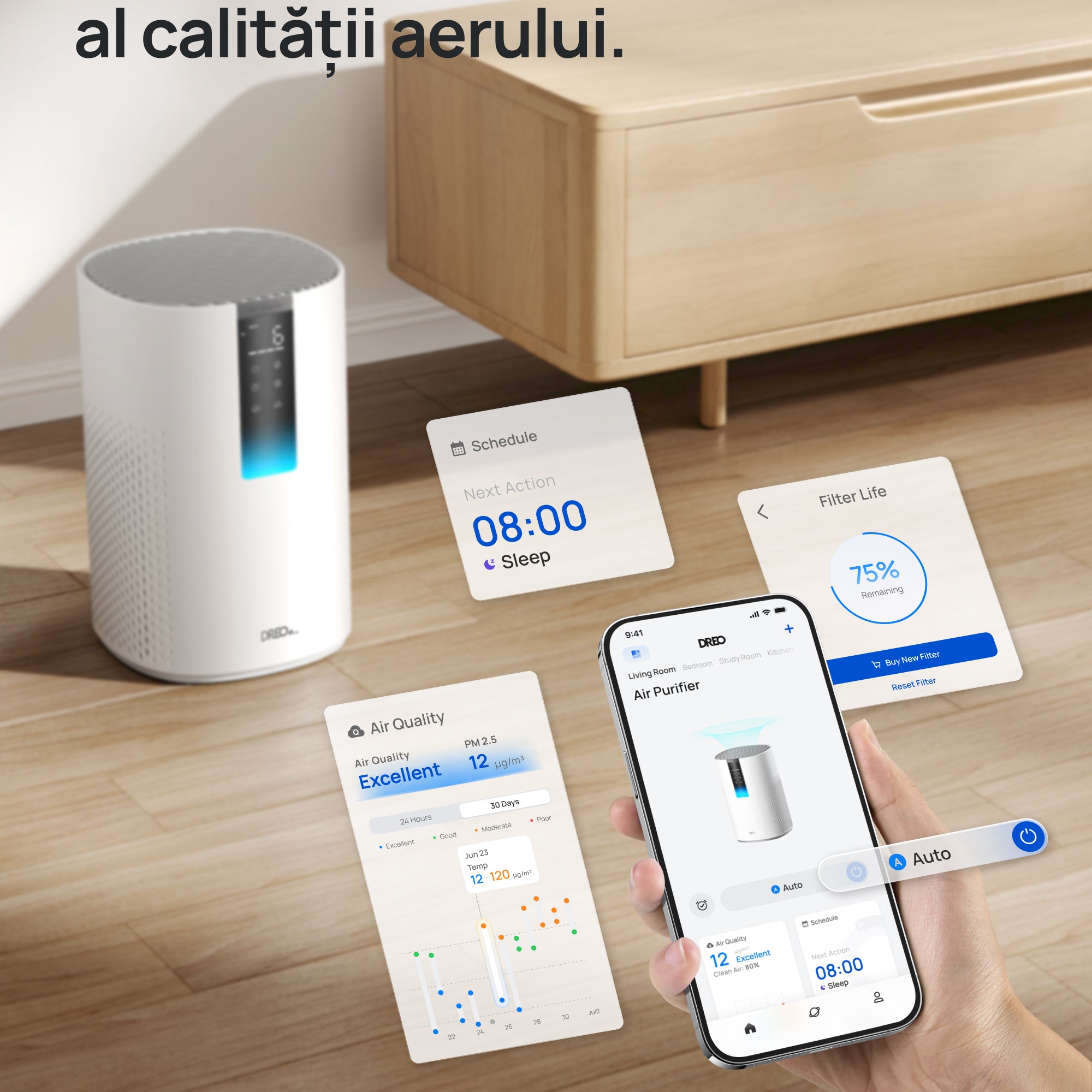 Cu un debit de aer curat (CADR) de 202 m3/h, Dreo 505S purifică eficient spații de până la 82 m2/h. Este compact, dar puternic, fiind ideal pentru dormitor, bucătărie sau birou. Ajută la ameliorarea astmului, a alergiilor și a problemelor de sinusuri cauzate de praf sau schimbări sezoniere.