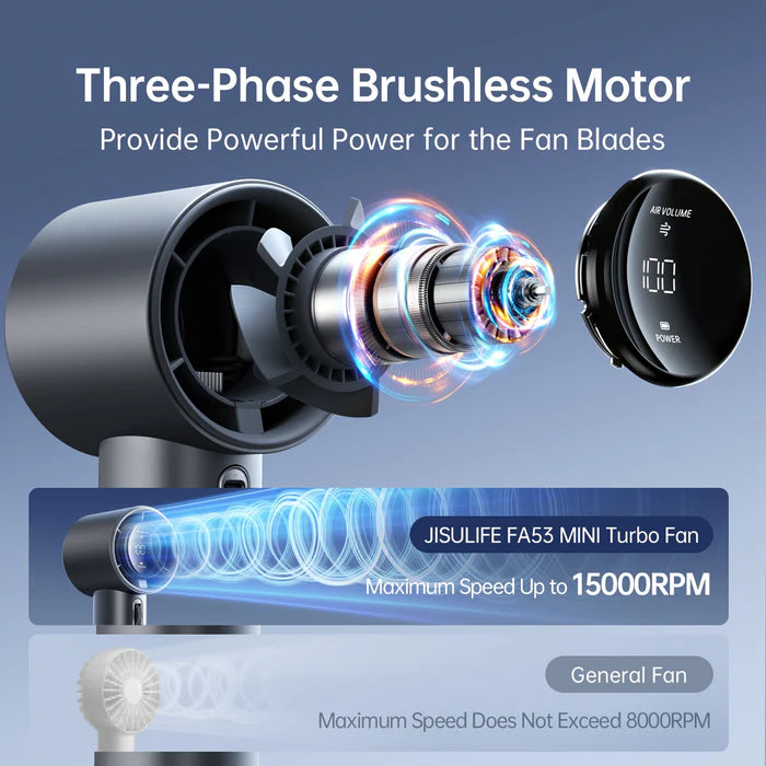 Manual de utilizare pentru Ventilator portabil de mână JISULIFE Pro1S, autonomie 3-15h, baterie 5000mAh, 100 viteze, încărcare rapidă, Afișaj LED, Bej